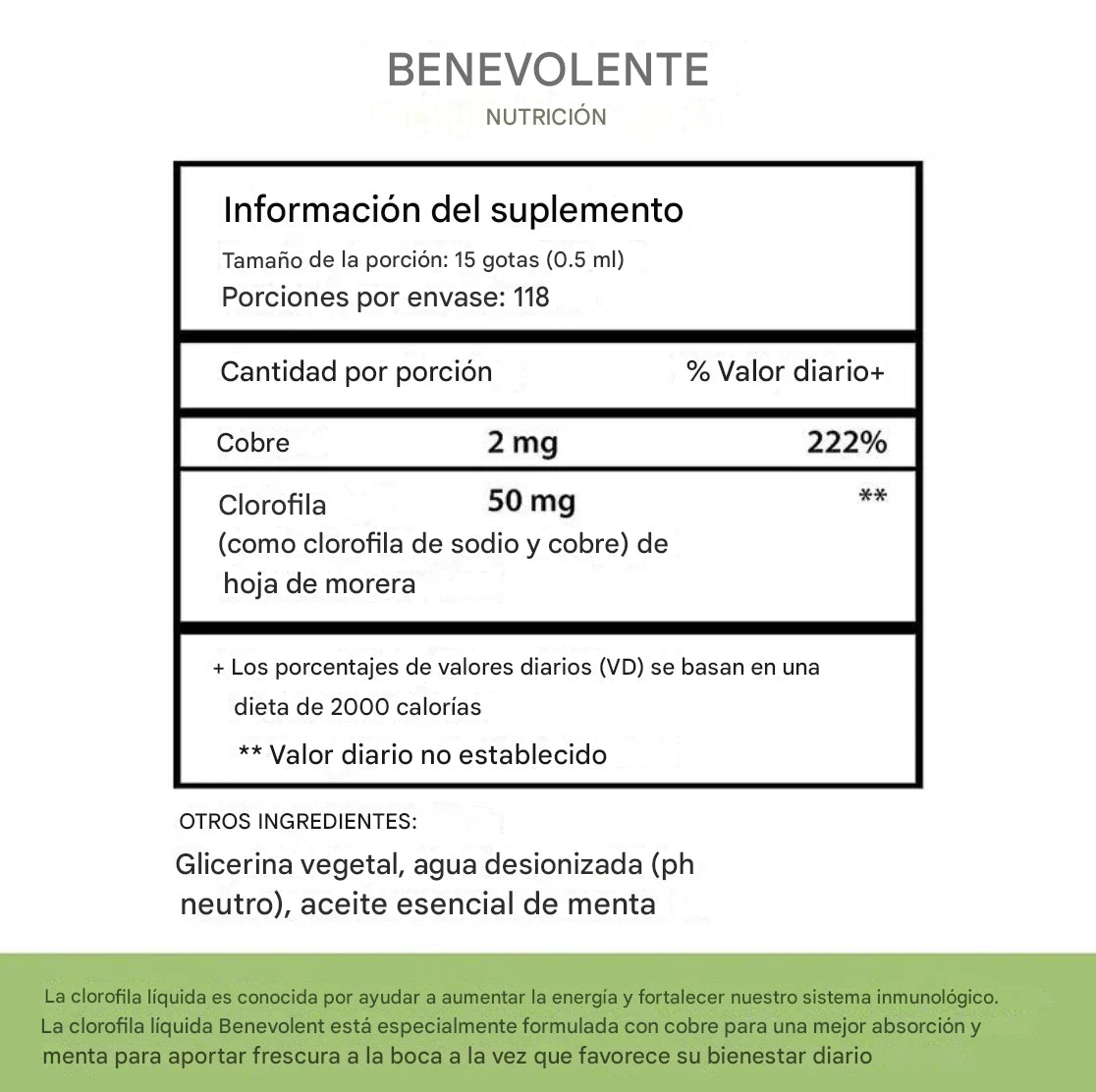 Agrega entre 15 y 30 gotas en un vaso grande de agua (aprox. 250 ml). Mezcla bien y ¡listo! Tu “agua verde” está lista para hidratarte y revitalizarte.